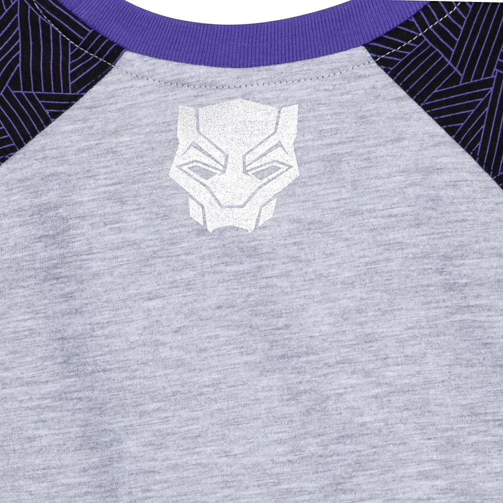Your child can strike a regal pose in this Black Panther ”Wakanda Forever” raglan T-shirt featuring bold screen art of their favorite super hero and the famous oath written in the Wakandan alphabet. With rich colors and an iconic pattern on the sleeves, this soft heathered jersey tee celebrates a legend with timeless style.